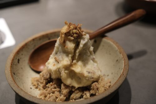 ごろっとしたそぼろと、いぶりがっこのコリコリとした食感がいいアクセントに。